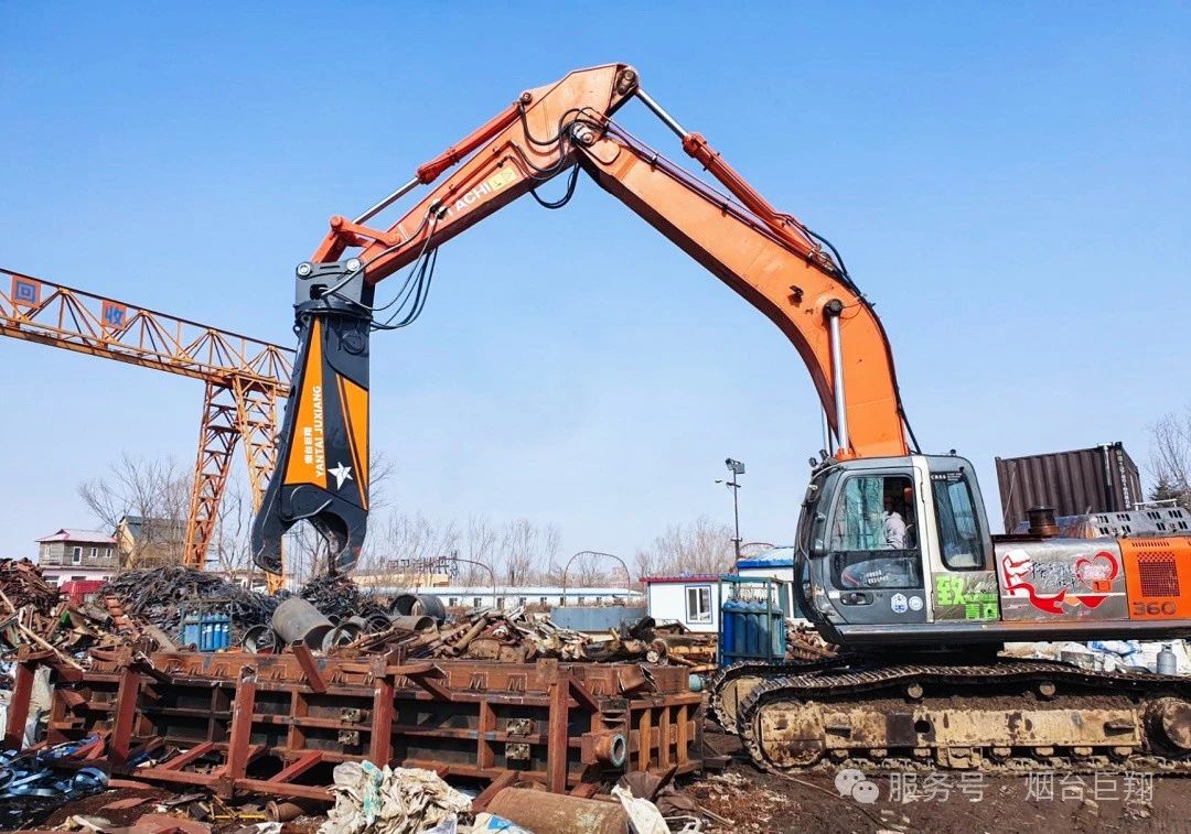 Double-cylinder hydraulic shears are made of high-strength wear-resistant plates. The two shear plates are equipped with synchronization devices to achieve synchronous opening and closing. The blades are made of high-toughness and high-strength steel, which can cut iron like mud. The hydraulic shears can rotate 360 degrees hydraulically to improve working capacity. The special speed-increasing valve design can increase the working speed and penetrate complex structures with huge shearing force. H and I-shaped steel structures can also be sheared and dismantled. This type of hydraulic shear has great use value in the scrap steel industry and greatly improves the shearing efficiency of scrap steel.