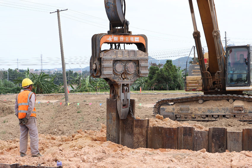 In order to carry out the smooth construction, a lead-hole drilling rig was used to assist. In the piling operation, certain challenges are still encountered. The average piling time of 12-meter steel plate piles is controlled at about 1-2 minutes, while other brands of piling machines used in different bidding segments have encountered unprecedented difficulties. It can be seen from the comparison video below that at the same construction site, other brands of piling machines have repeatedly piled and pulled piles, and the excavator tilted its head. The piling operation is still difficult, which shows that Juxiang piling machines have obvious advantages in the construction of hard soil.